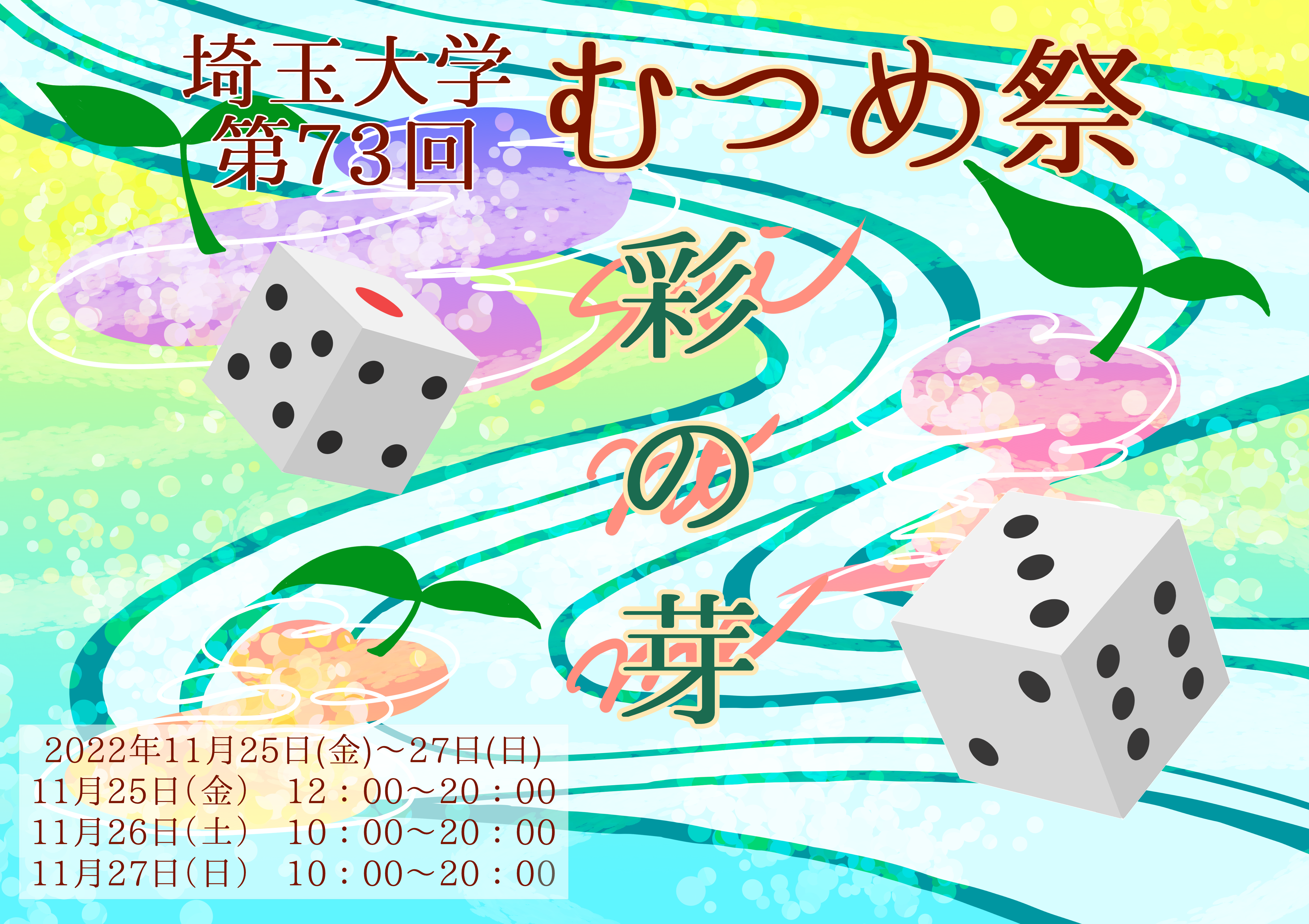 「彩の国さいたま」のキャッチコピーにもある「彩」という字を使うことで、埼玉大学が埼玉県を代表する大学であることへの誇りや、むつめ祭が明るく華やかな学園祭となることへの期待などを表しています。「芽」は始まりの象徴であり、2年間の休止を経てこれから成長していくむつめ祭への希望の思いが込められています。また,「さいのめ」という読みは「賽の目」と同音であり、サイコロは6つの目があることから「むつめ」にもつながるというユーモアも混ざったテーマです。