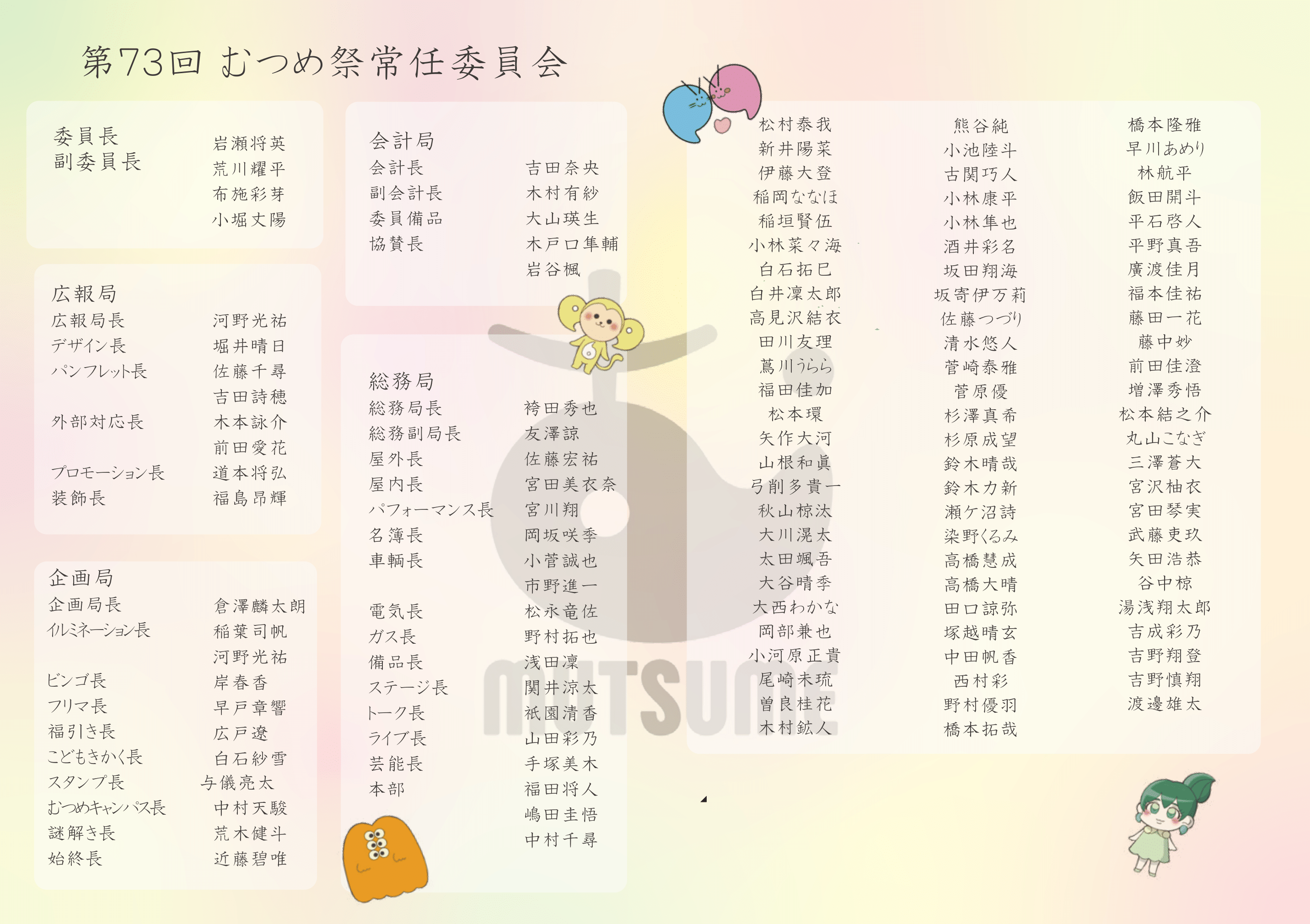 我々としましても、第70回以降3年ぶりのむつめ祭を大変楽しみにしております。コロナもあり、例年とは大きく異なりますがそれでも、来ていただく方々が満足してくださるように努めてまいります。