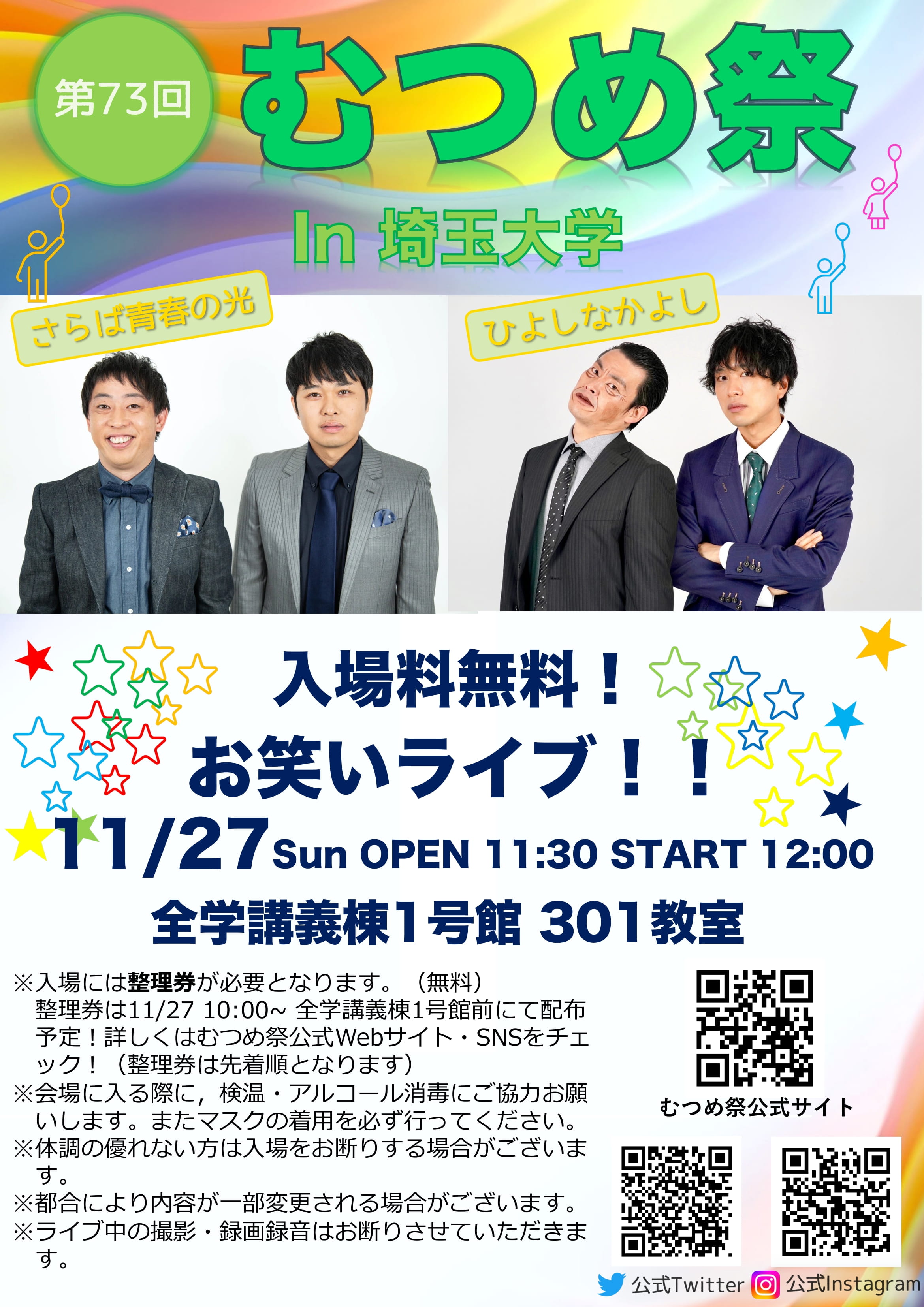 皆様に笑顔を届けてくれるべく さらば青春の光 ひよしなかよし がスペシャルゲストとして登場。埼大生はもちろん遊びにきてくださる方々のむつめ祭の最高の思い出になることは間違い無いでしょう!皆様のご来場をお待ちしております。