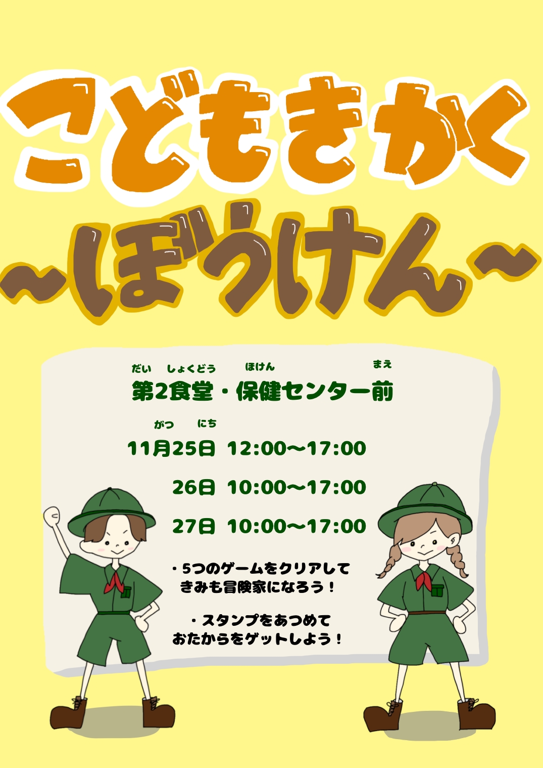 こどもきかくでは第2食堂・保健センター前で幼児〜小学生を対象にしたこども向けのゲーム・工作体験の企画を行います。今年度は「冒険」をテーマに、小さな探検家たちに様々なミッションをクリアしてもらいます! 具体的には、